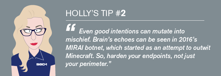But with the ability to make floppy disks unreadable, Brain went beyond CREEPER, since it wasn’t just sending a piece of text whizzing around – Brain executed code. It was actual malware, the first true virus. Brain’s legacy lives on in every illicit virus circulating today.